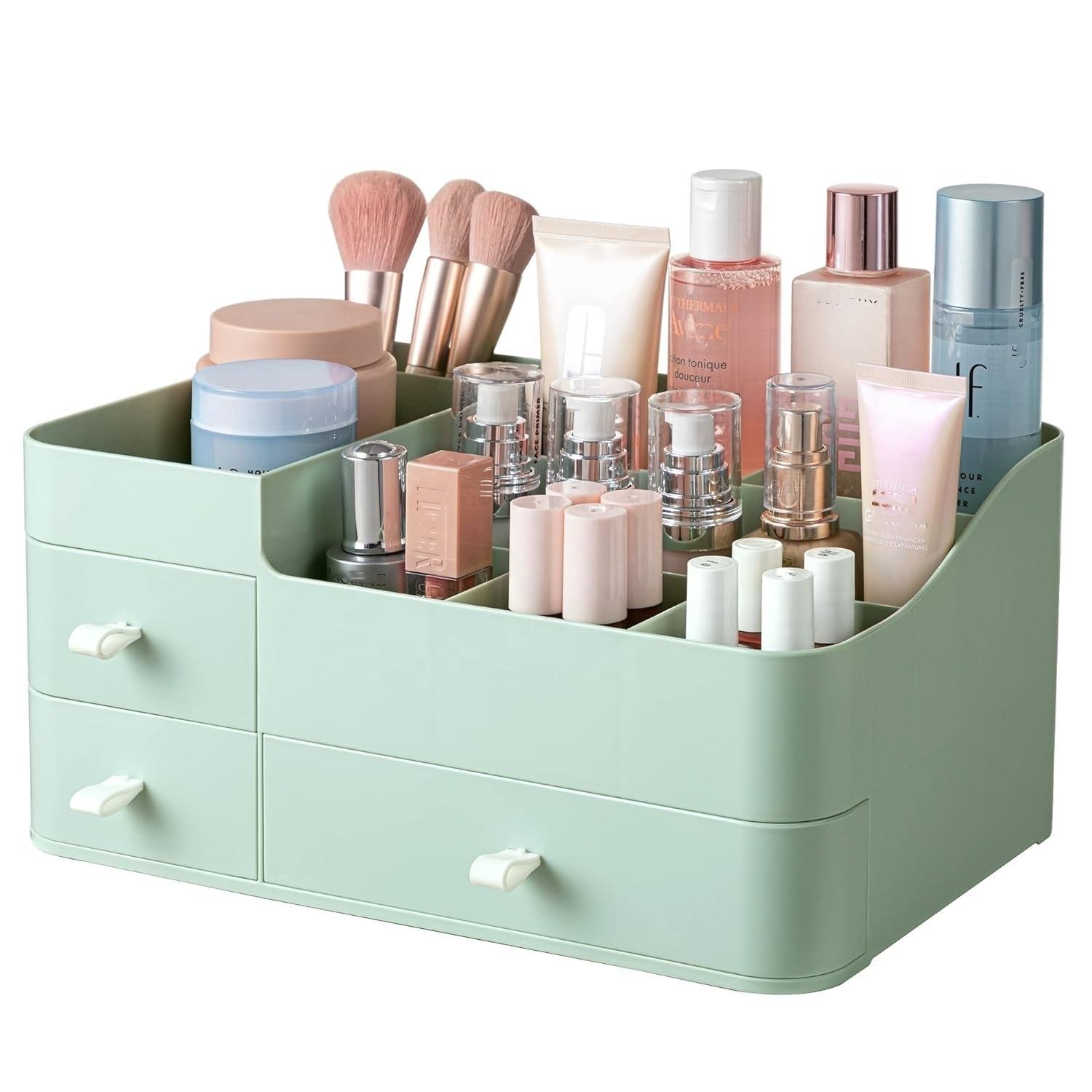 About this item ➣【Designed for Everyday Use】- The Organizer Meticulously Every Detail, Considered to Bring You the Most Intuitive and Convenient Makeup Storage Yet. Our Versatile Organizers are Designed Beautifully. It Suits Your Various Storage Needs: Makeup Organizer, Vanity Organizer, Desk Organizer, Bathroom Organizer, etc! ➣【Large Capacity Classified Storage】 - 1 large drawer and 2 small drawers for your facial mask or vanity kit&small item. 8 top compartments hold at least 8-10 lotions, 6-8 moisturizer 15-20 makeup brushes of various sizes, 10-20 lipsticks, 8-10 nail polishes, 10 eyeliners, 3 large eye shadow palettes, and other small everyday collection. Let you quickly find what you need with the MIUOPUR makeup organizer. ➣【Multifunction OrganizerOrganizer box is also perfect for storing office supplies such as pens, post-it notes, glue, tape, scissors, stapler, paper clips, cell phone, business cards, etc. Or spices, condiments, grains, canned food, salt, and pepper grinders and other kitchen supplies. ➣【High-Quality Environmentally Friendly Materials】-The Organizer box made of high-grade PP material safety and environmental protection.Non-toxic and odorless that you can safely store delicate cosmetics, Never fall. Never out of Style! ➣【Great Gift】 - The elegant and practical design often used as a fantastic present for Weddings, Valentine’s Day, Birthdays, Christmas, etc. This is a great gift that will make your friends very happy and organized in the next few years.